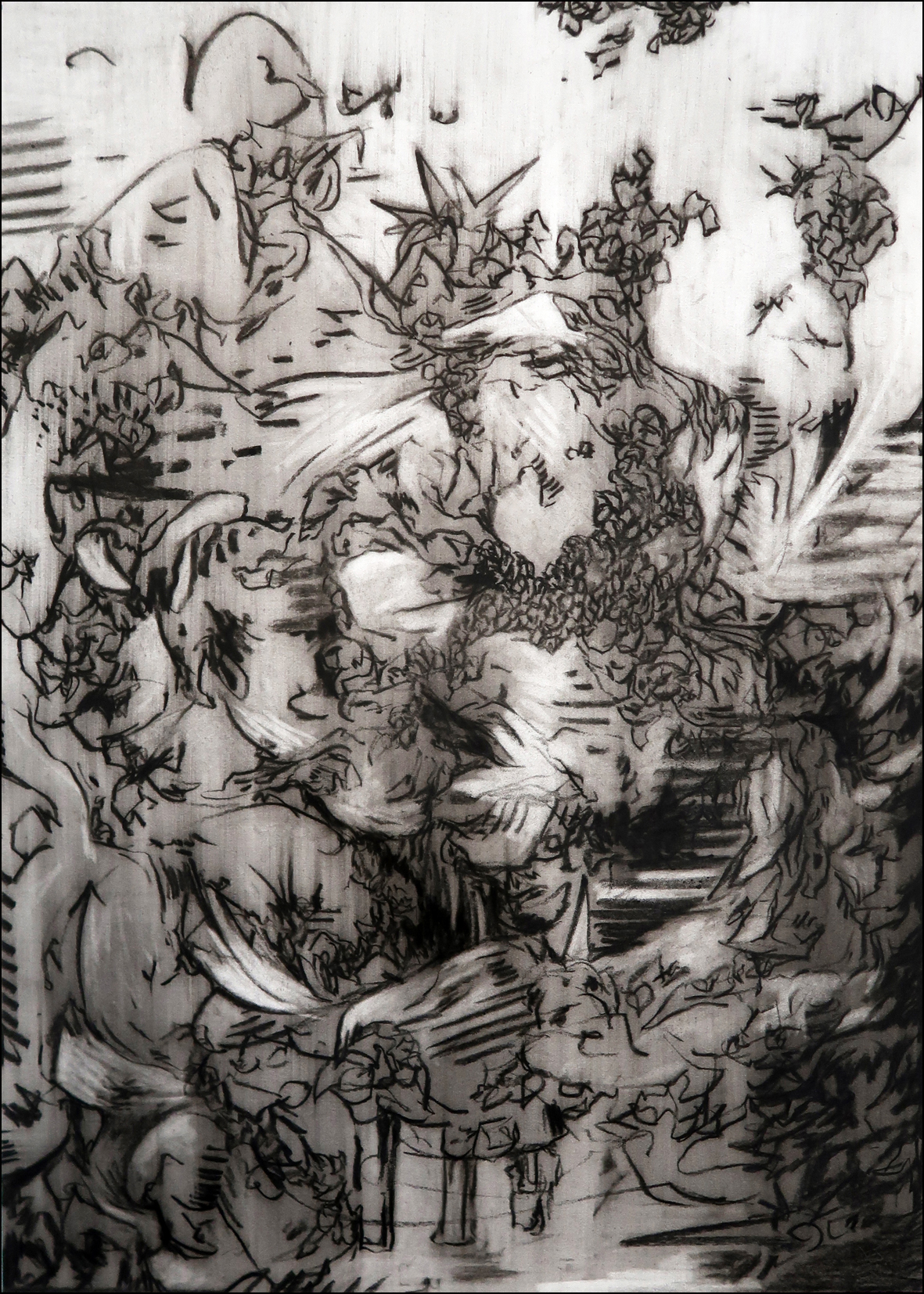 La caresse de la violence, l’amour des larmes, la vie à mort ! Les couches de dessins se superposent, laissant la trace du premier geste. L’histoire s’écrit au fur et à mesure en toute transparence.