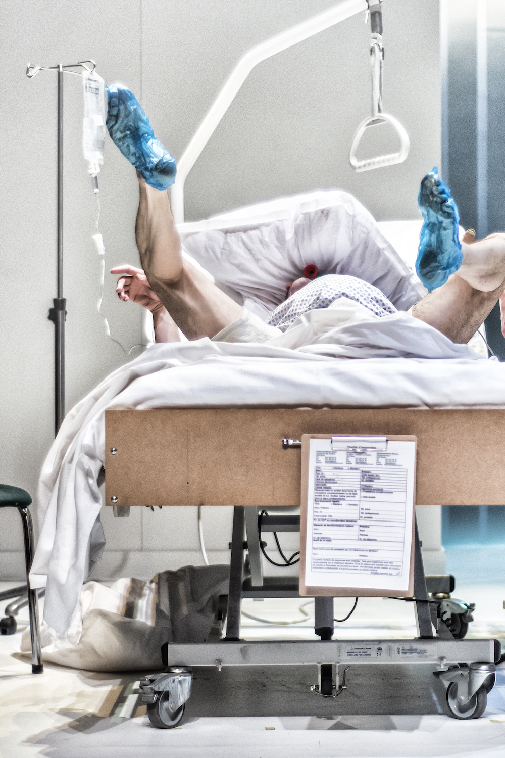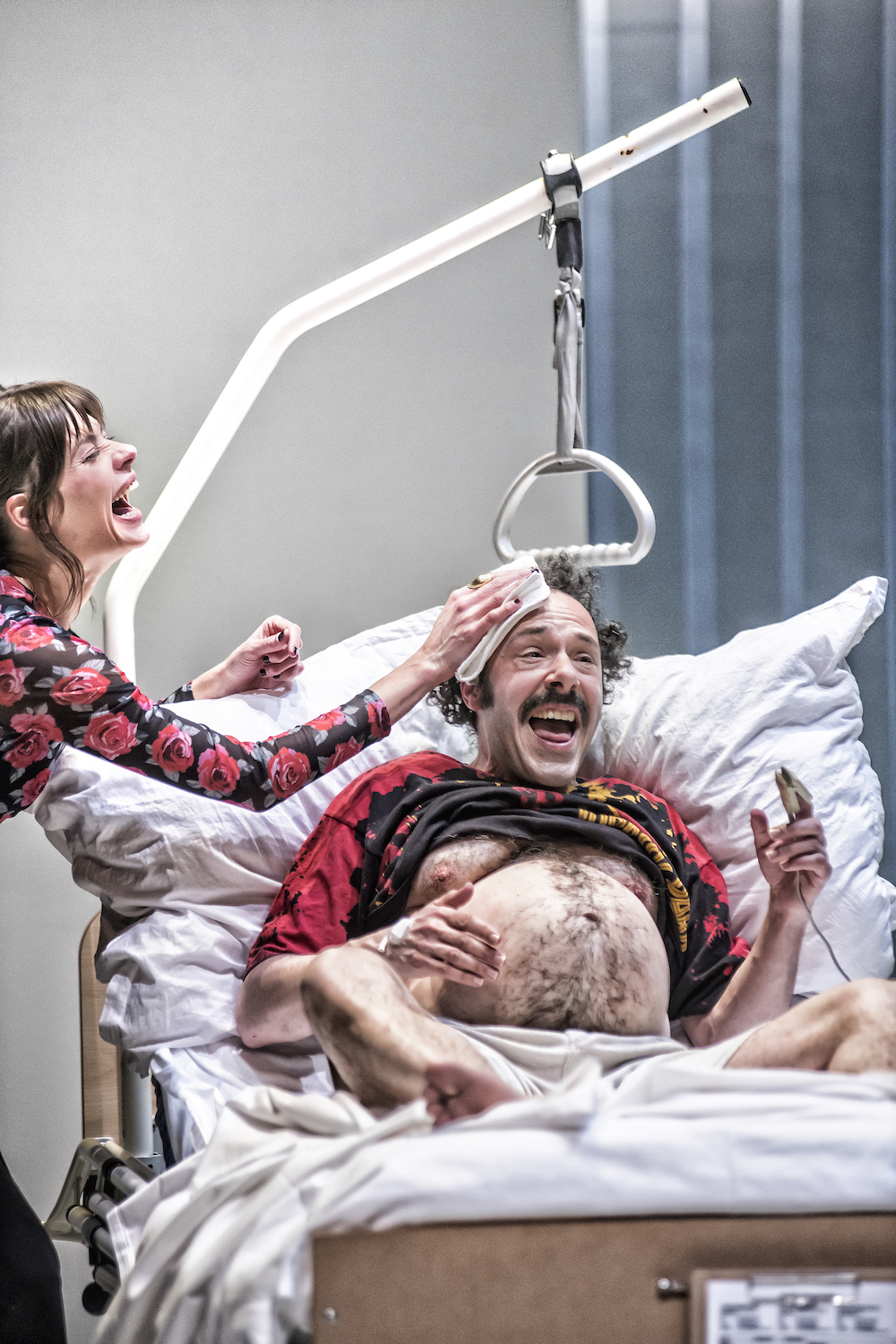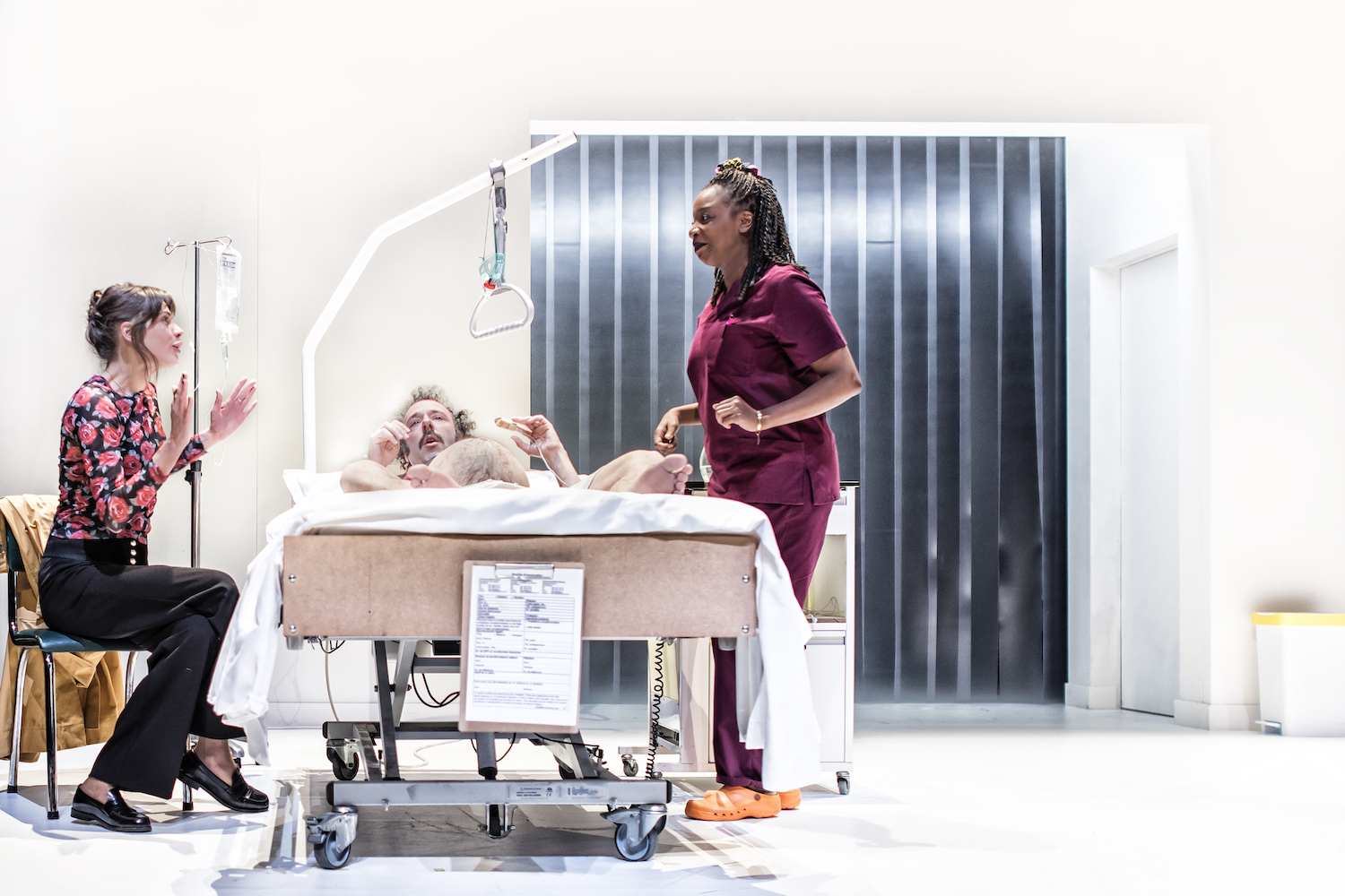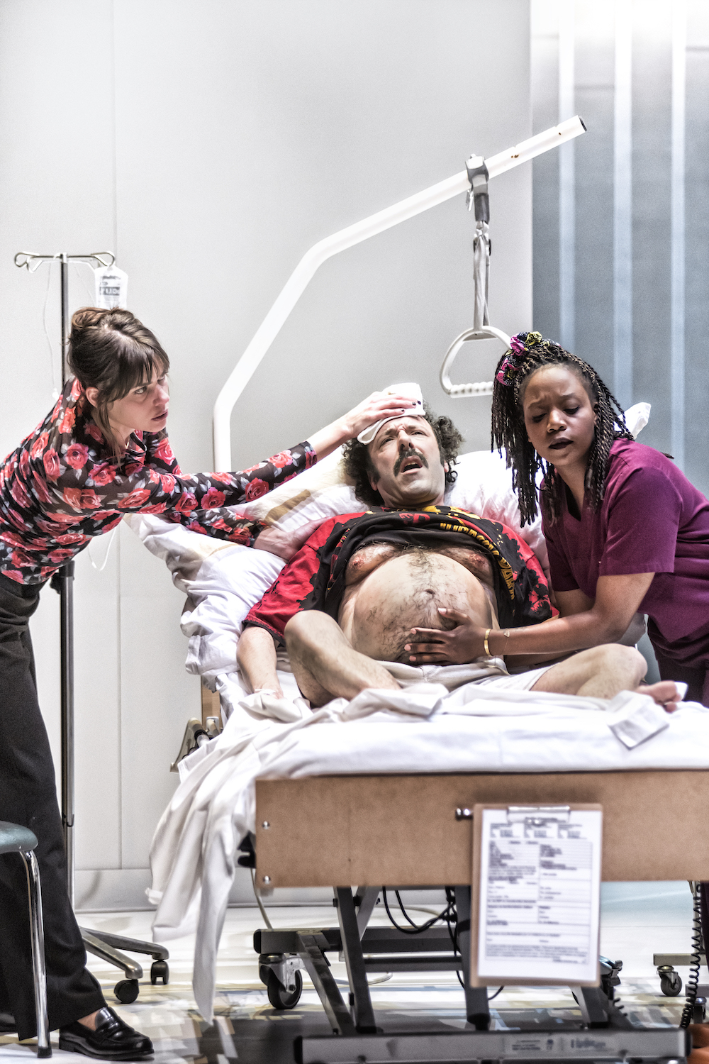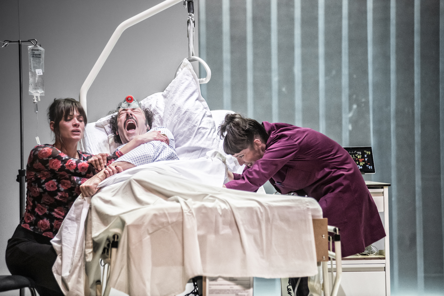 Ed, donc, va connaitre les affres de l’accouchement en attendant sa césarienne. Il est inquiet, grognon, injuste... Et la sage-femme imperturbable et l’obstétricienne, largement débordées par les urgences médicales, ne le rassurent pas beaucoup.